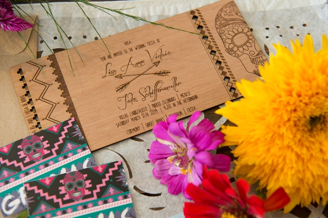 The invitation suite by newlywed Lisa of Ivy Invite jumps head first into the Day of the Dead theme. At first this may appear to be a morbid theme for a wedding, but in fact this is a huge fiesta in Mexico strongly connected to their most sacred religious holiday and is all about gathering together with family.