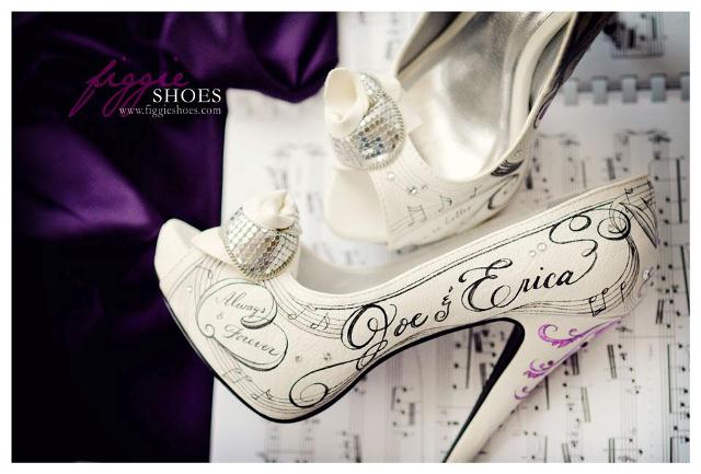 Deborah Thomson of Figgie Shoes hand paints on your awesome heels, stylish flats, or even your super cool sneakers for your wedding day footwear. Any pair of wedding shoes can be painted on, excepting patent leather shoes, and you can choose any which special message or picture to include in your own personalised shoe art design. Wedding shoes never looked so special! Below images by Figgie Photography