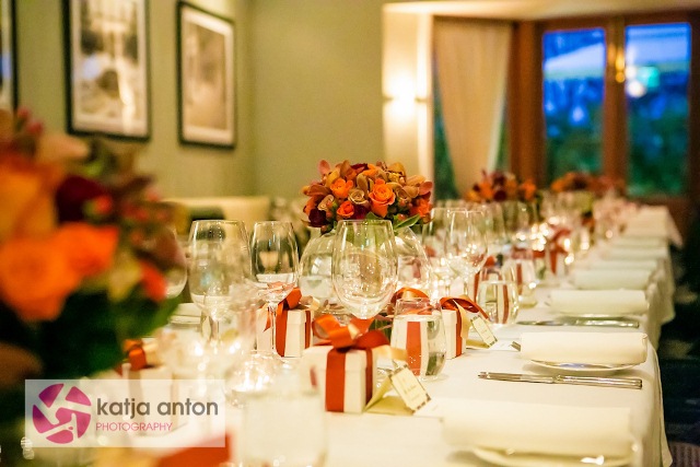 DIY: We made the bonbonniere ourselves. We filled little white boxes with our favourite chocolates, and then tied them up with big bows of beautiful satin ribbon. They looked spectacular placed out on the long dining table and Katja took some great photos which really showed them off.